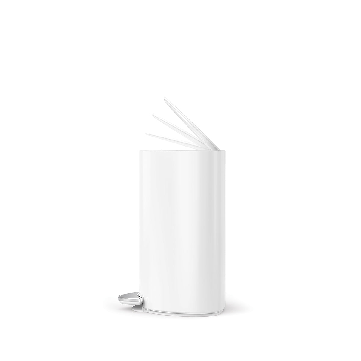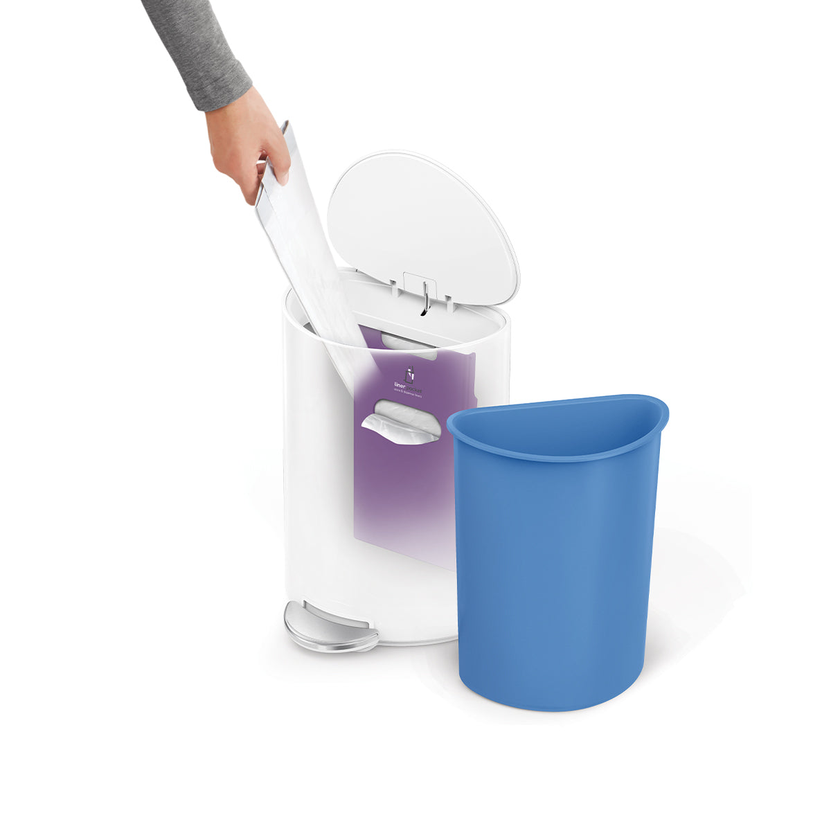 Soft semi-round shape and invisible hinge make this can perfect for putting right up against the wall. Internal liner pocket stores and dispenses liners one at a time for a faster liner change. Durable steel pedal is designed to last, and our patented lid shox technology ensures a smooth, silent close every time. The can’s stainless steel surface is protected by an invisible silver-ion coating that resists fingerprints and germs (brushed model only). Our code B custom fit liner fits this can perfectly — no bunching or slipping for a cleaner trash experience.